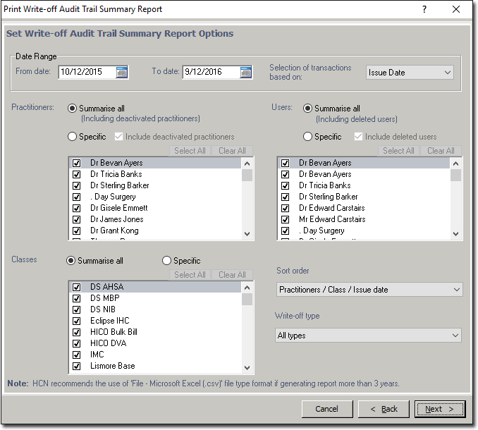 In the following example the Audit Trail Write-off Summary Report criteria is displayed. The other audit trail reports offer similar options.