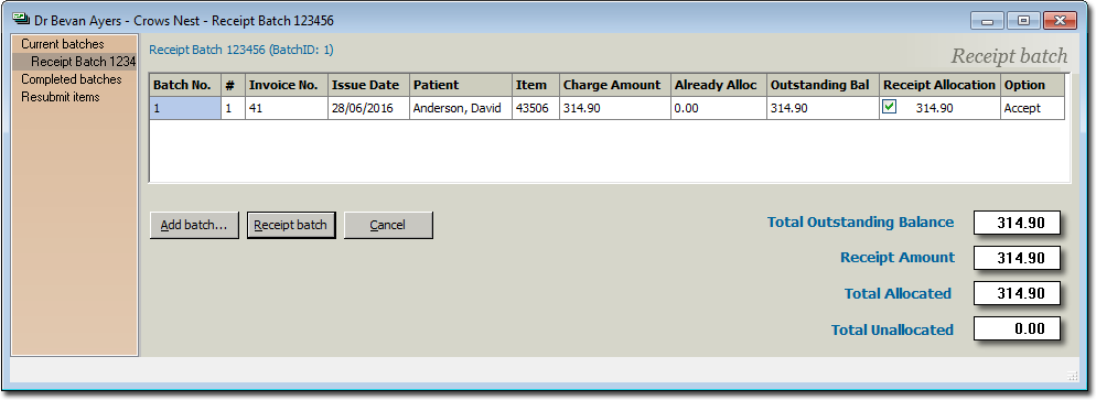 Click OK You are presented with the Receipt Batch details.