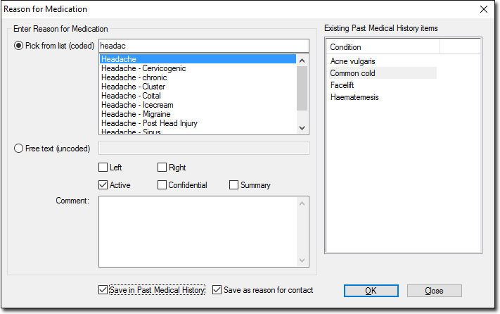Save in Past Medical History check box. Ticking this check box will save the Reason for Medication to the patient's Past History tab. Enabling this check box also makes available the Active, Confidential and Summary check boxes.