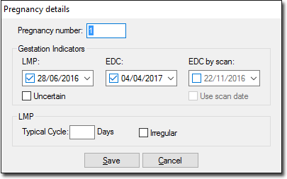 Ensure the LMP and EDC or EDC-by-Scan dates are correct. This information is used to calculate the estimated pregnancy finish date, after which upon opening the patient's record, you will be prompted to confirm whether the patient is still pregnant.