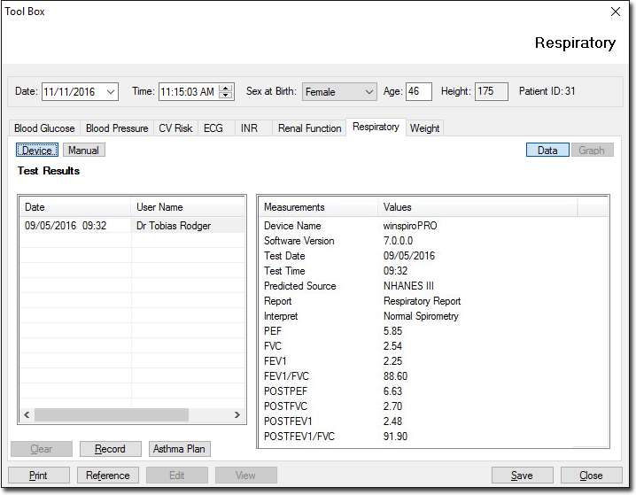 Once the test has been successfully performed, exit the spirometery application. You will be returned to Clinical.