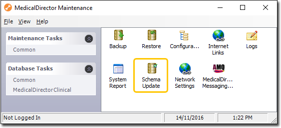 As the Schema Update utility works on your patient database, it is available only to computers that have the database installed i.e. where Clinical / Pracsoft is installed as either a Server or Standalone application. If you have a Workstation or Mobile installation of Clinical, you will not see the Schema Update icon in MedicalDirector Maintenance.